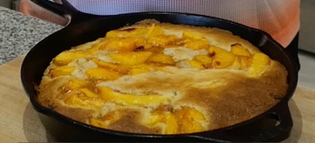 Carefully remove the skillet from the oven, and pour in the cake batter. DO NOT STIR. Bake in the preheated oven for 5 minutes. Remove from the oven and spoon in the peaches and accumulated juices over the cake batter. DO NOT STIR THIS. Return skillet to oven and continue baking until the top of golden brown and cake is slightly firm to the touch – about 25 – 30 minutes. Serve warm with ice cream