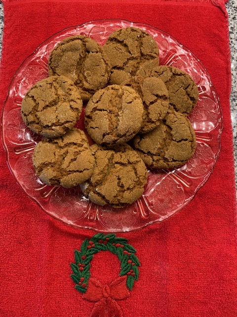 Gingersnaps: Combine 3/4 cup shortening, 1 cup brown sugar, 1/4 cup molasses, and 1 egg till fluffy. Sift together 2 1/4 cups flour, 2 teaspoons soda, 1/2 teaspoon salt, 1 teaspoon ground ginger, 1 teaspoon ground cinnamon, and 1/2 teaspoon ground cloves, stir into the molasses mixture. Form in small balls. Roll in granulated sugar, place 2 inches apart on greased cookie sheet. Bake at 375 degrees for 12 minutes. Makes about 4 dozen.